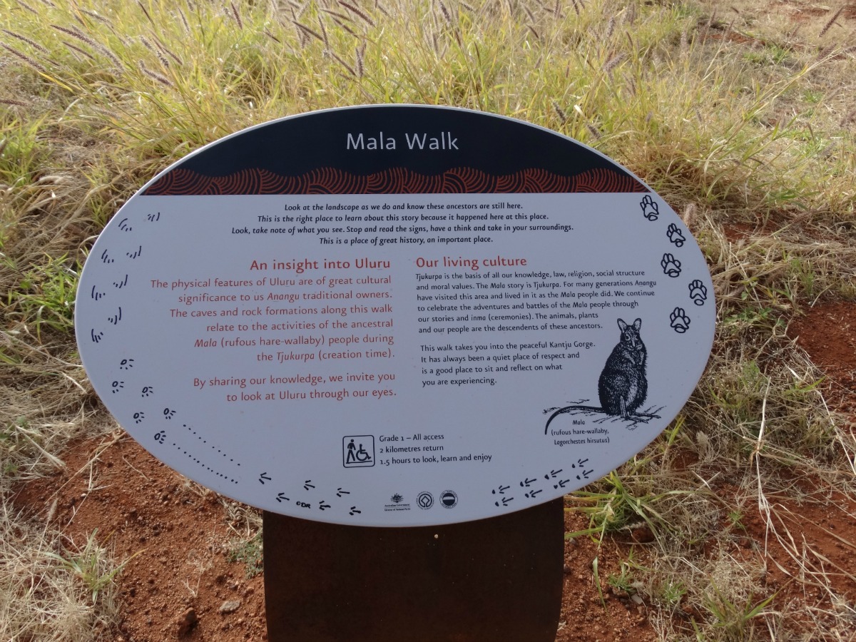 but first there is signage for the shorter 2 km walk ahead.  It reads in part: the physical features of Uluru are of great cultural significance to us Anangu traditional owners.  The caves and rock formations along this walk relate to the activities of the ancestral Mala (rufous hare-wallaby) people during the Tjukurpa (creation time).